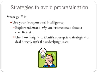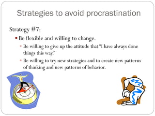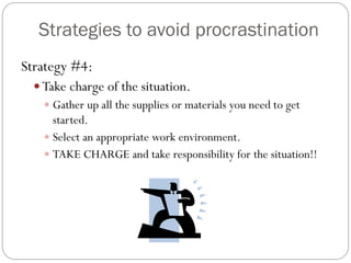 Strategies And Tips On How To Avoid Procrastination 1 Stop Thinking and Start Working. Fill your time with unimportant tasks that other people ask you to do instead of getting on with the important tasks already on your list.